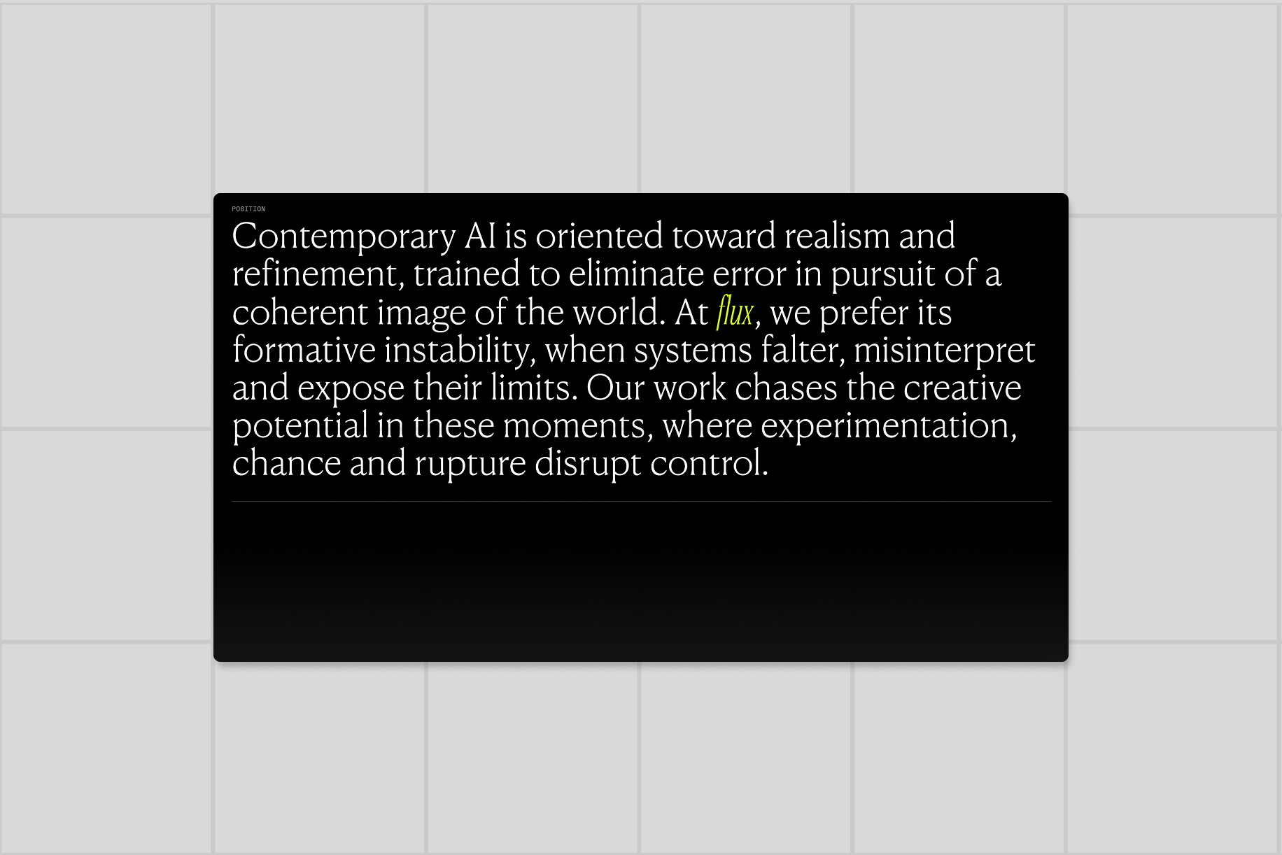 Together, the messaging, brand, and digital experience establish Flux as a forward-facing studio grounded in intention, authorship, and responsible experimentation.